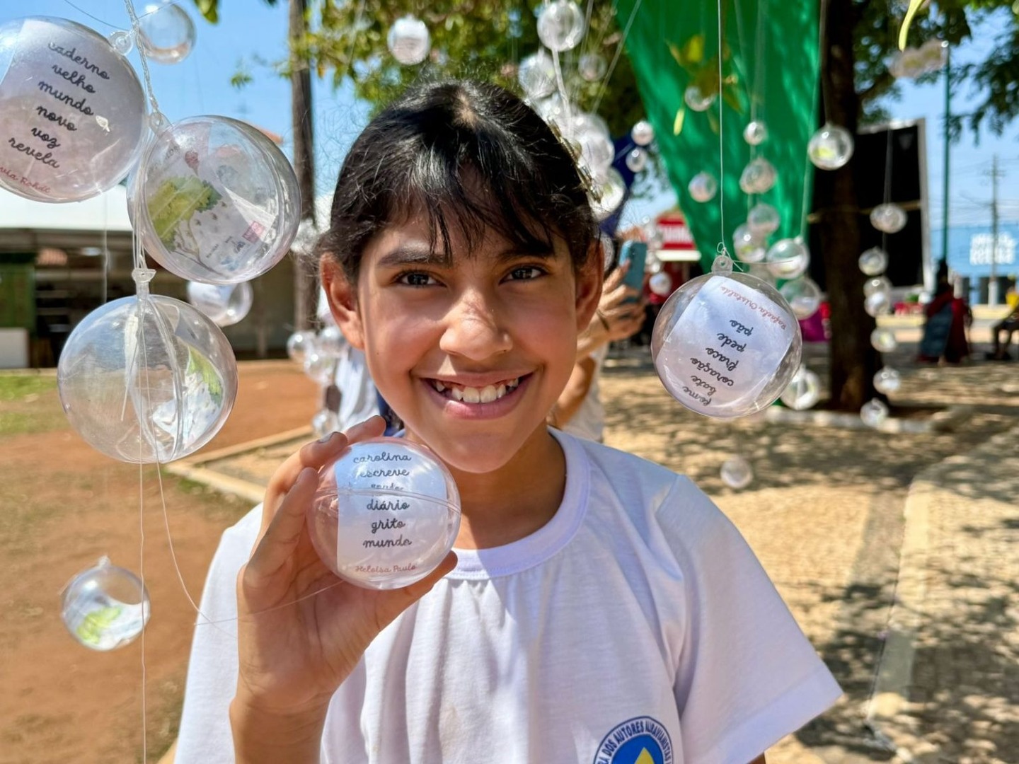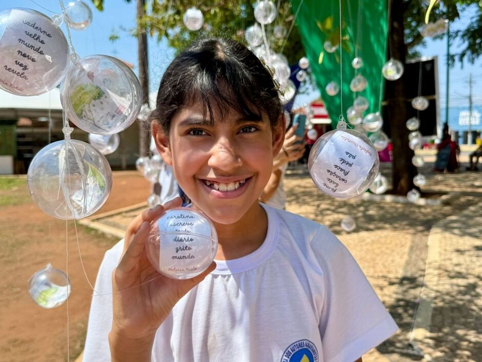 A mostra recebeu o título “Carolina vive no vento” e reúne poesias escritas por crianças e adolescentes indígenas, penduradas em bolinhas transparentes, convidando o público a refletir sobre a força da palavra em sua forma breve e poética.