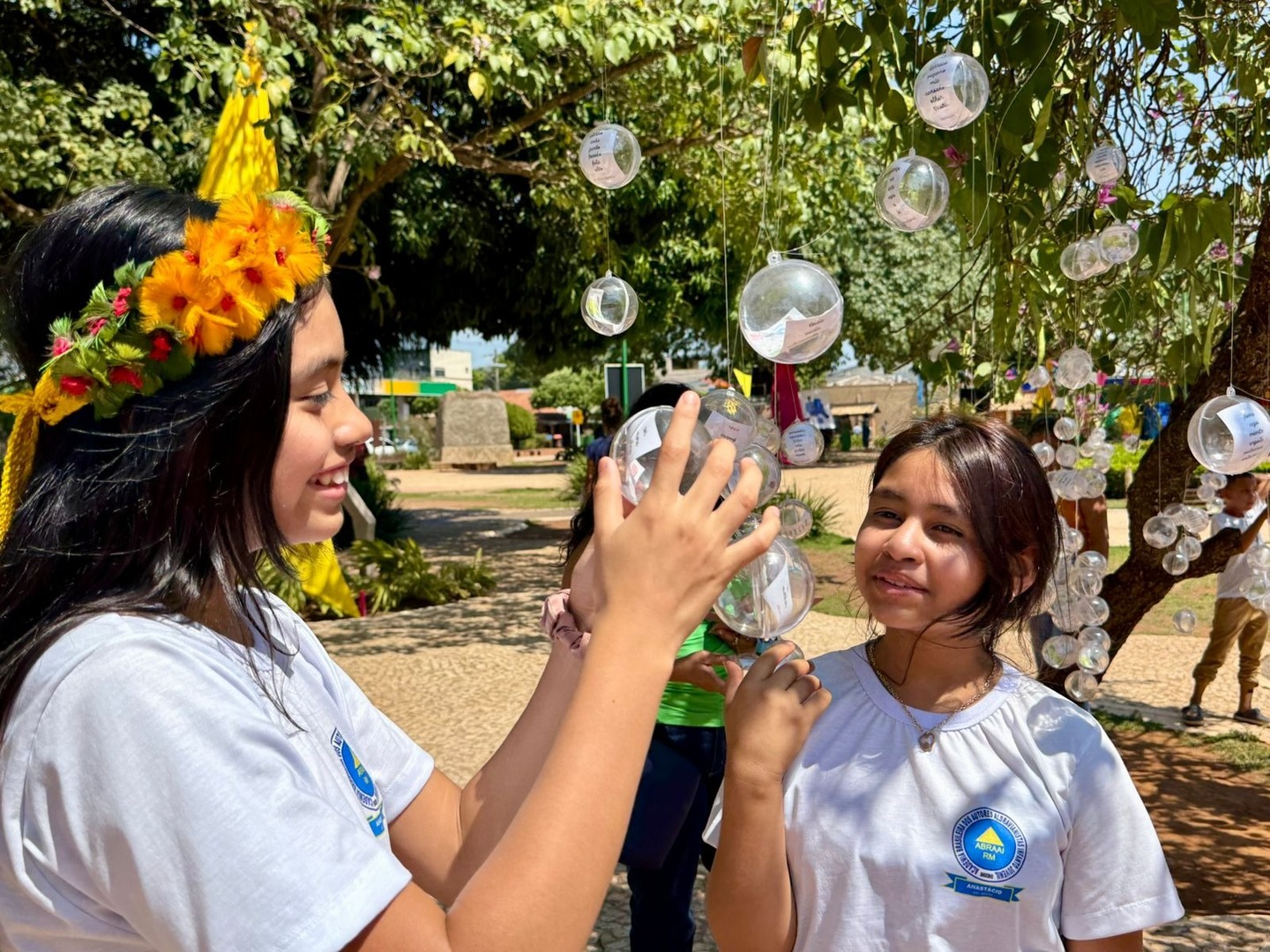 Cerca de 20 crianças da Aldeia Aldeinha, integrantes da ABRAAI – Academia Brasileira de Autores Aldravinistas Infantojuvenil de Anastácio (MS), participaram neste sábado (20) da 9ª Feira Literária de Bonito (FLIB). Depois de produzirem aldravias inspiradas no livro Quarto de Despejo, de Carolina Maria de Jesus, elas foram até a Praça da Liberdade conferir de perto suas criações expostas na “Árvore de Aldravias” e se envolveram em atividades culturais da programação.