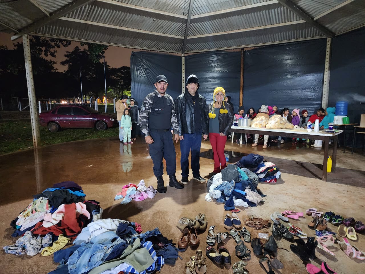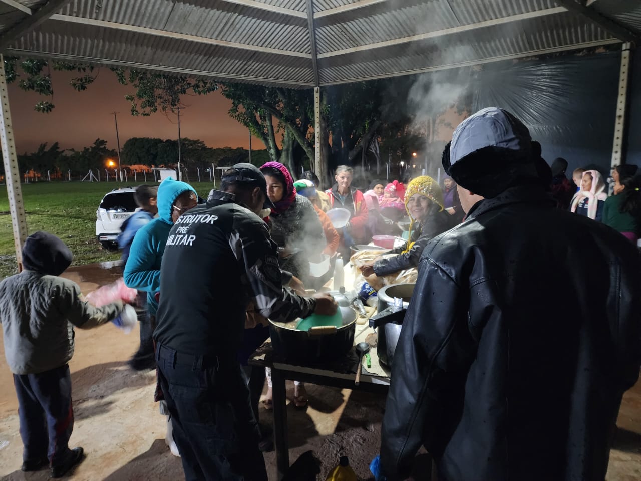 Com frio de 10°C, a Defesa Civil e uma escolinha de futebol se mobilizaram para entregar agasalhos e oferecer sopa, na noite desta segunda-feira (12), para moradores da favela ao lado do Castelinho, em Ponta Porã.