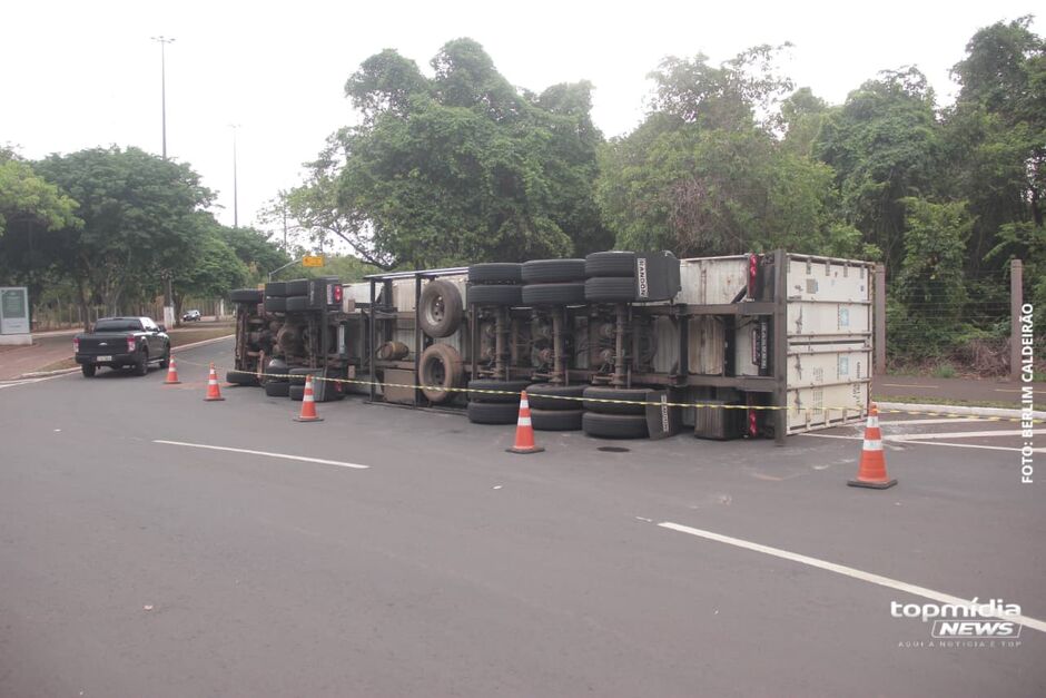 Uma carreta carregada com carne tombou no início da tarde desta sexta-feira (17) dentro do Parque dos Poderes, em Campo Grande. O acidente aconteceu após o motorista, de 55 anos, fazer o trevo da Avenida do Poeta.