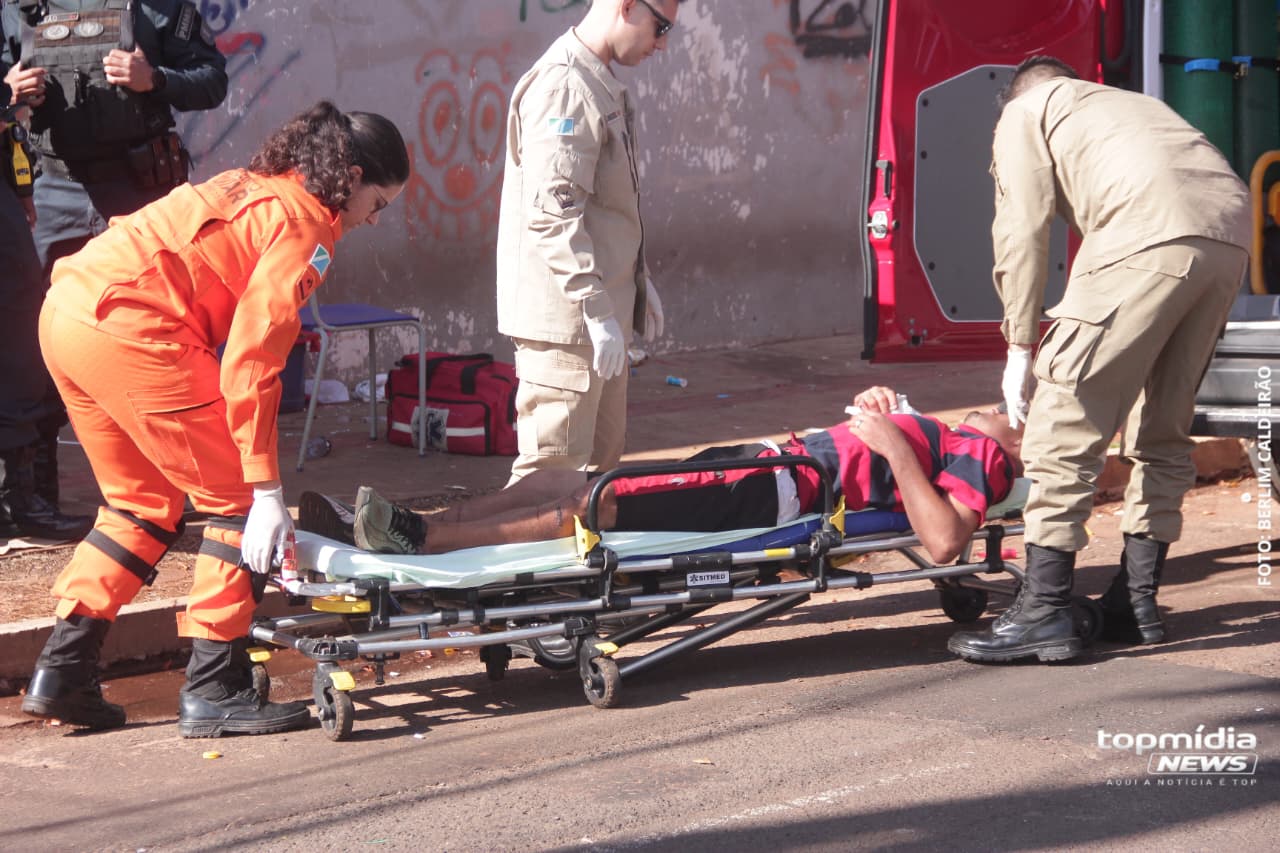 Quando os bombeiros chegaram, encontraram o homem deitado no chão. De acordo com a equipe, não foi possível avaliar com precisão a gravidade dos ferimentos ali mesmo, e a prioridade foi encaminhá-lo rapidamente para atendimento médico, devido à aglomeração de pessoas no entorno. Ele foi colocado na ambulância e levado para uma unidade de saúde, aguardando regulação.