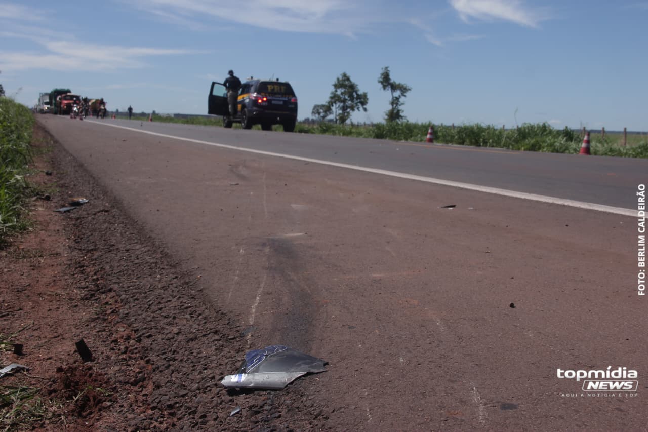 O pneu dianteiro da carreta explodiu e danificou a cabine, mostrando a força do impacto. Além disso, pedaços da motocicleta ficaram espalhados pela pista e até um pedaço de osso da perna da vítima foi encontrado no local.