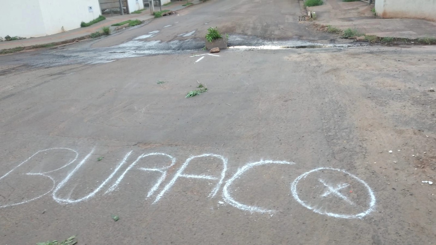 Moradores do Jardim Colúmbia, em Campo Grande, decidiram improvisar um aviso no asfalto para alertar motoristas sobre um buraco na Rua Pindaré, esquina com a Avenida Uraçá.