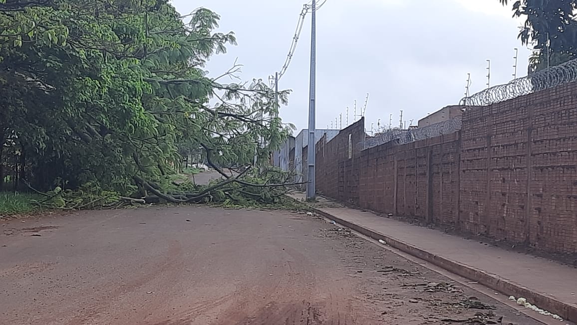 A Rua Professora Odete Trindade Benites, trecho da linha do ônibus Rouxinóis, ficou intransitável, após a queda de um grande galho de árvore no meio da via, durante temporal em Campo Grande, nesta quinta-feira (6).