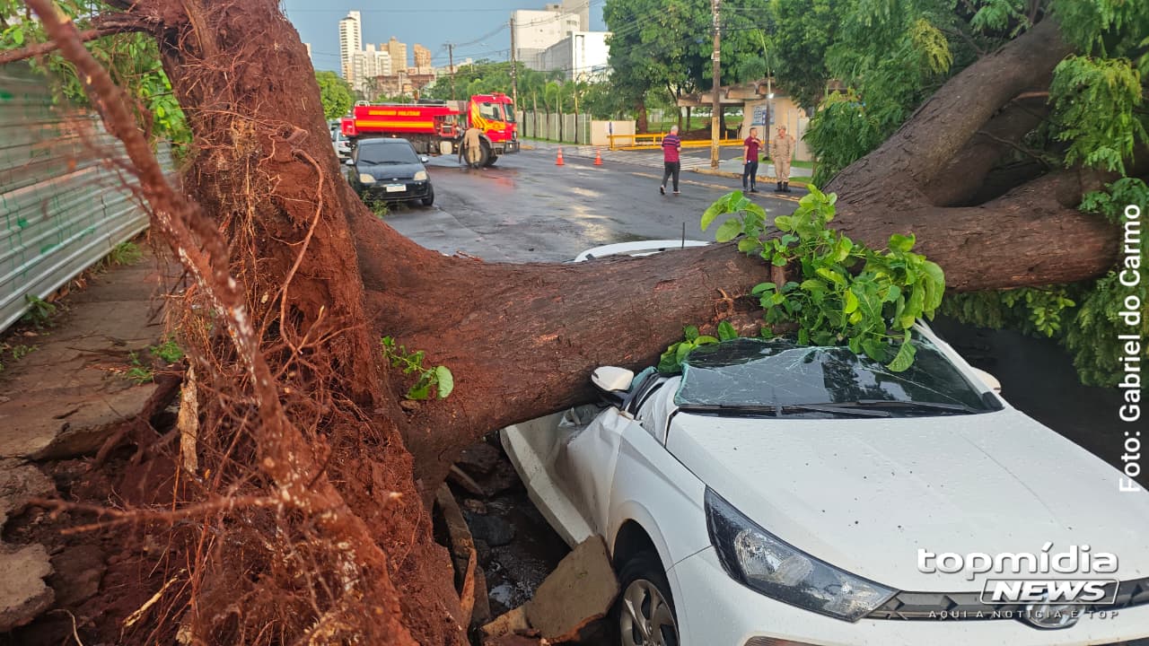 A queda de uma árvore destruiu completamente um veículo Hyundai HB20 que estava estacionado no cruzamento da Rua Eduardo Santos Pereira com a Rua 13 de Maio, próximo da Santa Casa, na tarde deste sábado, no Centro de Campo Grande.