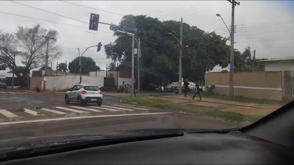 Uma batida entre um carro e uma motocicleta no cruzamento da Avenida Roseiras com Lúdio Martins Coelho, no Jardim Bonança, em Campo Grande, no início da tarde desta segunda-feira (8).