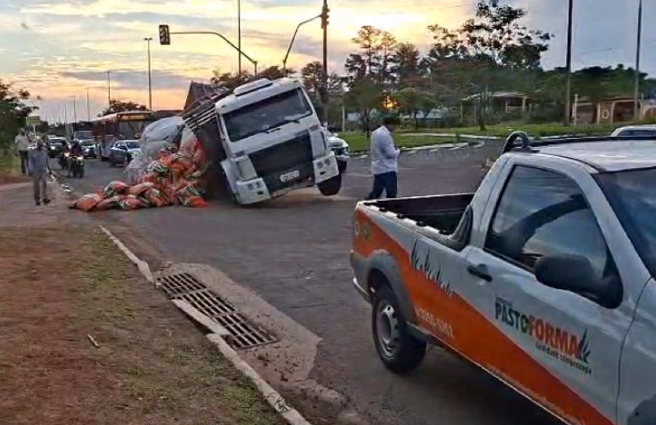 De acordo com uma testemunha, o motorista tentou realizar uma conversão quando a carroceria se abriu, fazendo com que o veículo tombasse junto com a carga. Parte do material transportado ficou espalhada pelo asfalto.