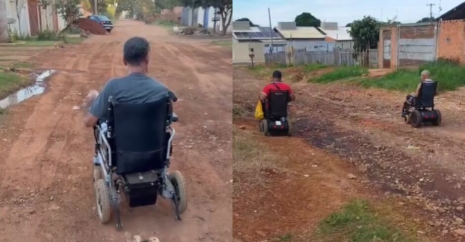 Nas imagens, o homem aparece com dificuldade para se locomover na cadeira de rodas, desviando de buracos e desníveis da via de terra batida. A cena mostra a precariedade da infraestrutura local e a falta de condições mínimas de acessibilidade.