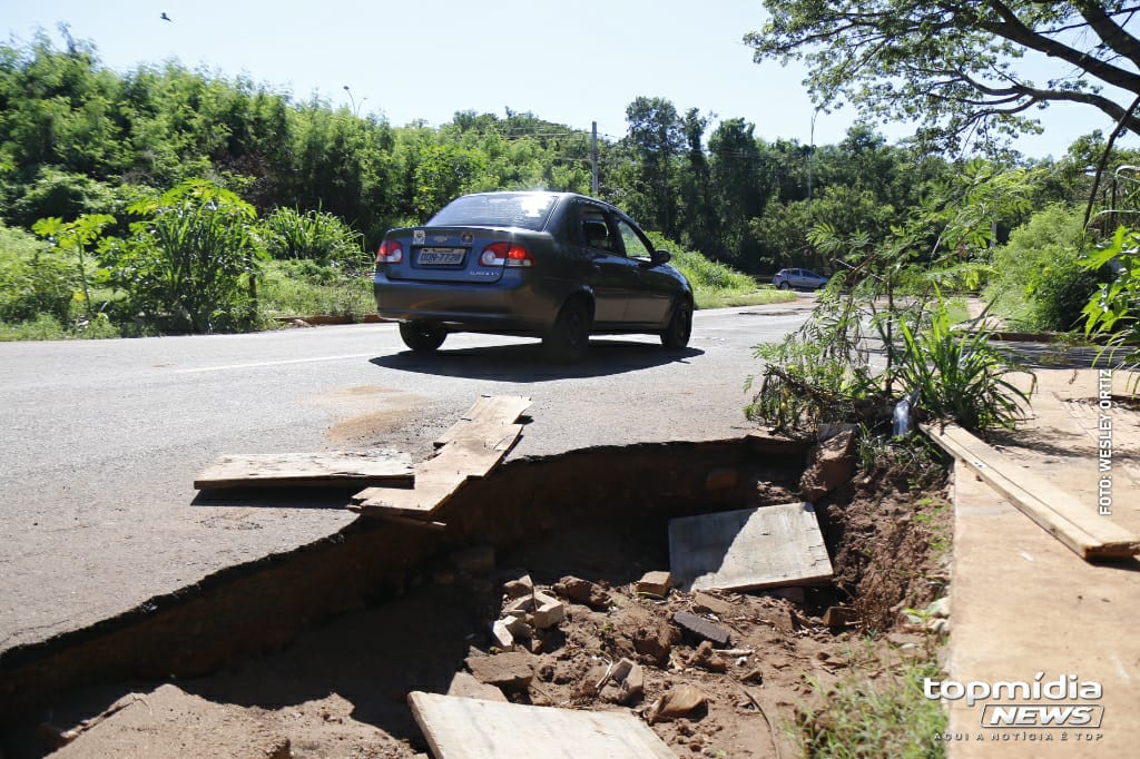 Duas crateras abertas no cruzamento das ruas Dr. Laureano e Theodomiro Serra, no bairro Jardim São Francisco, em Campo Grande, estão começando a invadir a pista por onde passam centenas de veículos diariamente.