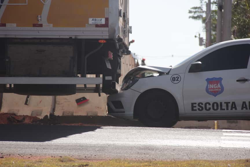 Na sequência, um caminhão baú refrigerado não conseguiu parar a tempo e colidiu na traseira do rodotrem. Logo atrás, um carro de escolta armada, modelo Voyage branco, acabou batendo no caminhão baú.