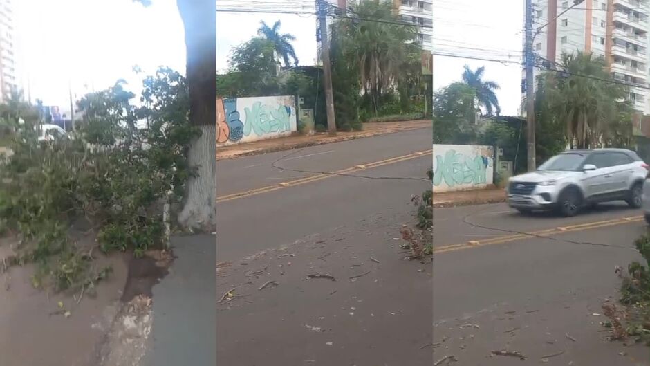Conforme vídeo enviado ao TopMídiaNews, o galho caiu no meio da pista, entre as ruas Fidelina da Silva Venda e Vidigal. Moradores relataram que já acionaram a Energisa, pois o fio está enrolado no galho, ainda energizado.