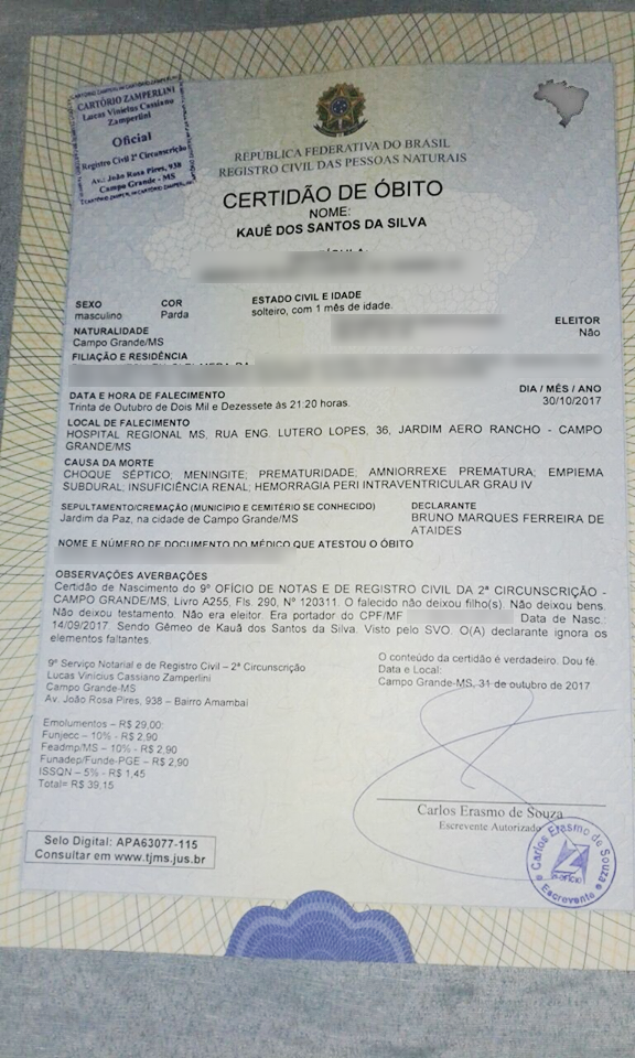 “Depois dos resultados desses exames, que mostrava que a bactéria seria do leite, pegaram e me deram um monte de desculpas, dizendo que não sabiam como isso tinha acontecido, de onde tinha surgido a bactéria, mas ele não aguentou e foi a óbito após um mês e meio internado na UTI. Ele não resistiu por causa da infecção, que acabou com os órgãos dele, e os médicos dizendo que se ele sobrevivesse ficaria em cima de uma cama, que ele não ia comer e só ia vegetar”, explica a mãe, como se relembrasse cada um dos mais de 40 dias que passou se desdobrando entre cuidar da filha de cinco anos e do bebê gêmeo, que foi para casa.
