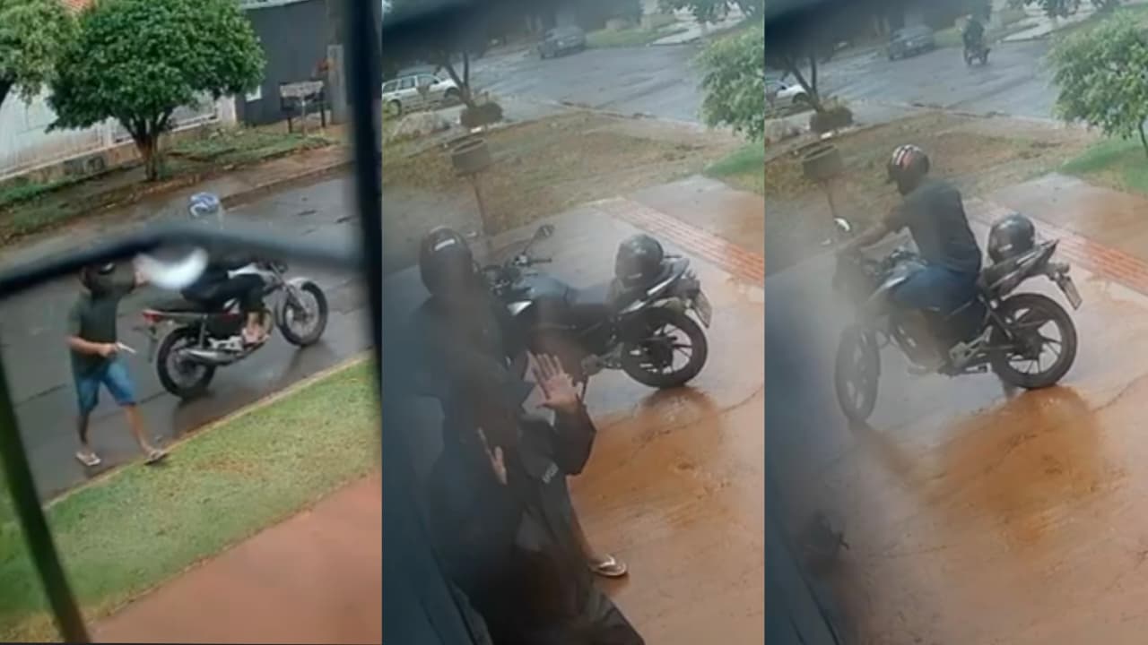 Câmera de segurança flagrou a ação dos criminosos, logo após a chuva. Na imagem é possível ver o momento que os bandidos passam de moto e retornam para furtar o veículo, momento em que Paulo sai no portão e também perde o celular.