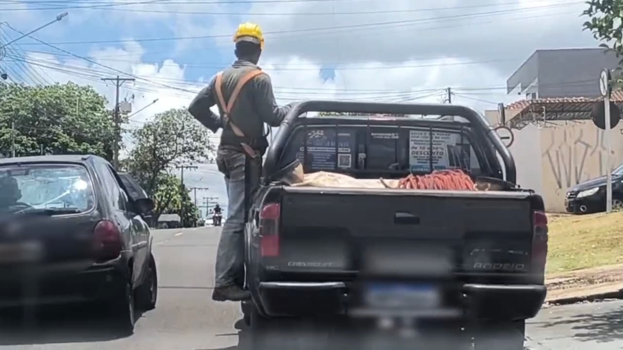 Quando a gente acha que já viu de tudo, o campo-grandense vai lá e faz! Na manhã desta segunda-feira (3), um homem utilizando faixas refletoras e até capacete foi visto pendurado do lado de fora de uma caminhonete, na rua Fillinto Miller, em Campo Grande.