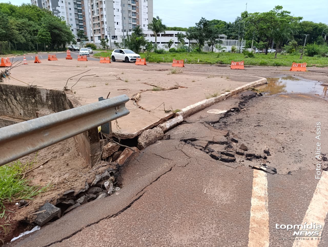 Com a estrutura comprometida, o trecho que segue da Rachid Neder em direção à Rua Otávio Pécora também está parcialmente interditado. A pista que liga a Euler de Azevedo à Otávio Pécora permanece tomada por lixo e areia arrastados pela enxurrada. O guarda-corpo da via também foi atingido, aumentando o risco para quem trafega pelo local.