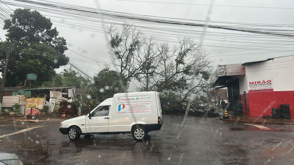 No bairro Tijuca, uma árvore caiu na Rua Gunter Hans, em frente a uma academia, atingindo um trailer e um carro estacionado.
