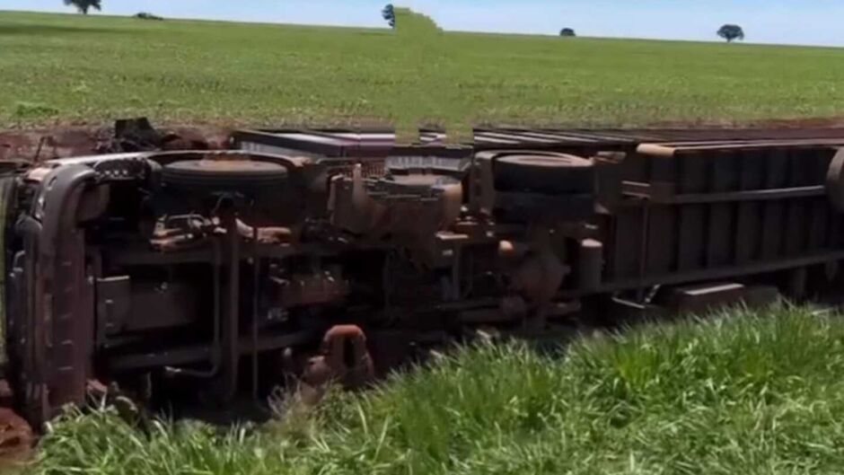 Uma carreta tombou nesta quarta-feira (26), na BR-060, entre Campo Grande e o município de Sidrolândia. Imagens mostram o veículo pesado caído na parte da vala da rodovia.