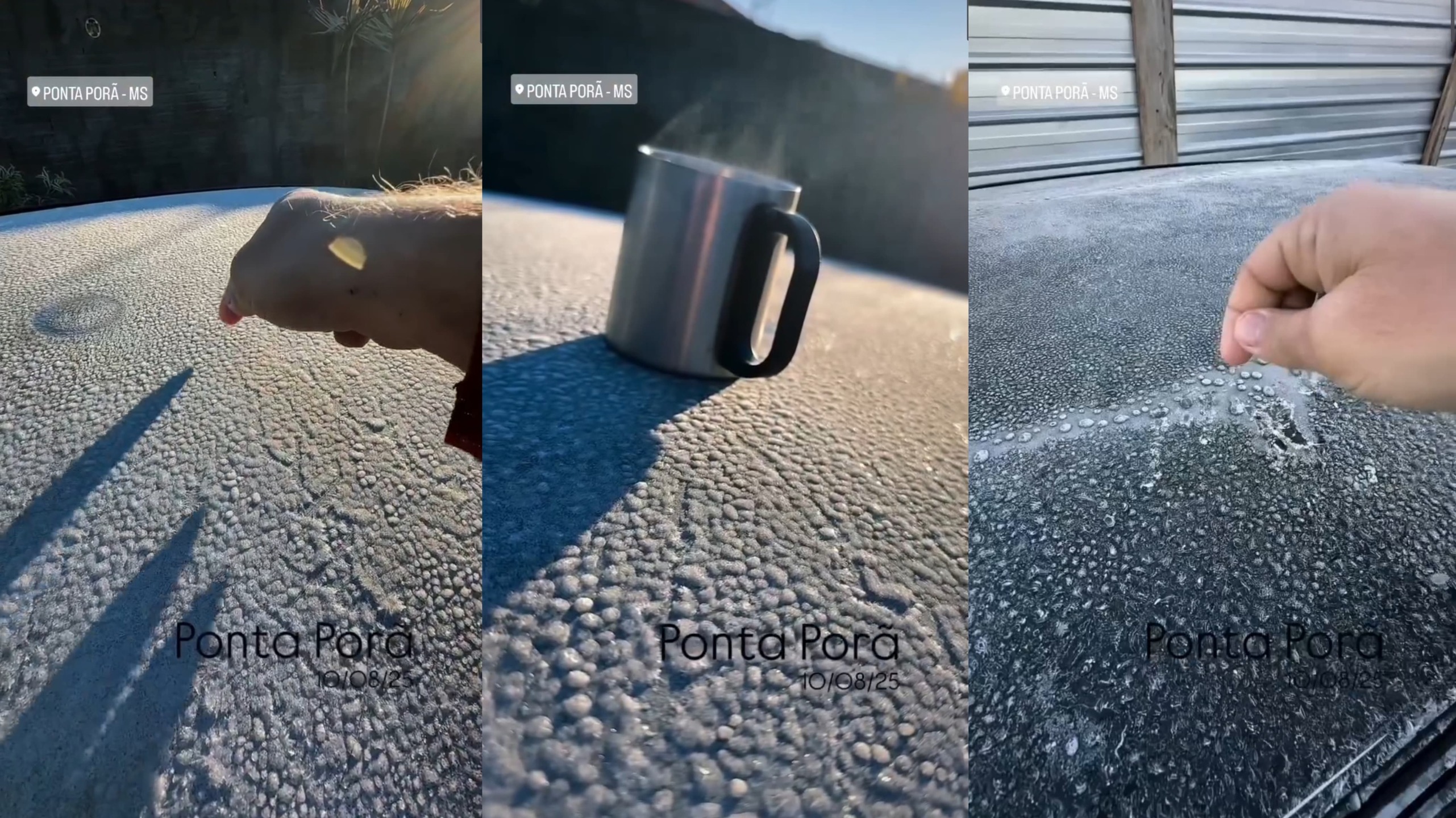 Em Ponta Porã, a mínima chegou a apenas 3°C. Apesar do frio intenso, alguns moradores aproveitaram para se divertir e registrar as finas camadas de gelo que se formaram sobre os carros e no gramado, como mostra um vídeo compartilhado na página do Campo Grande Mil Grau.