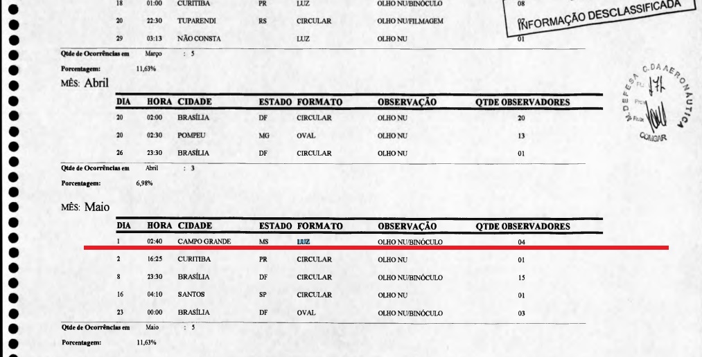 Relatório Estatístico de Objetos Voadores Não Identificados atribuído à Força Aérea Brasileira, a FAB, cita avistamento de fenômenos aeroespaciais desconhecidos em Campo Grande e Corumbá. O documento é classificado como ''Secreto''.