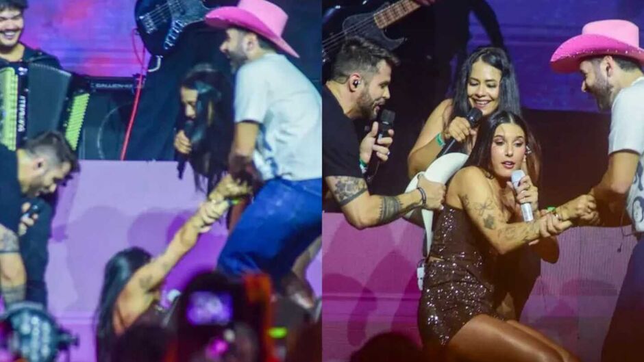 Apesar da queda, a artista se levantou rapidamente e continuou o show, mostrando bom humor diante do imprevisto.