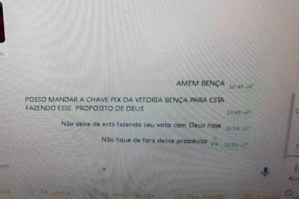 Os policiais apreenderam quadros de acompanhamento que mostravam metas de arrecadação: pelo menos dez atendentes tinham que bater R$ 500 por dia. Cada transferência Pix feita por fiéis era registrada como um passo rumo à “vitória”. O pagamento liberava o envio de uma oração padronizada pelo WhatsApp.