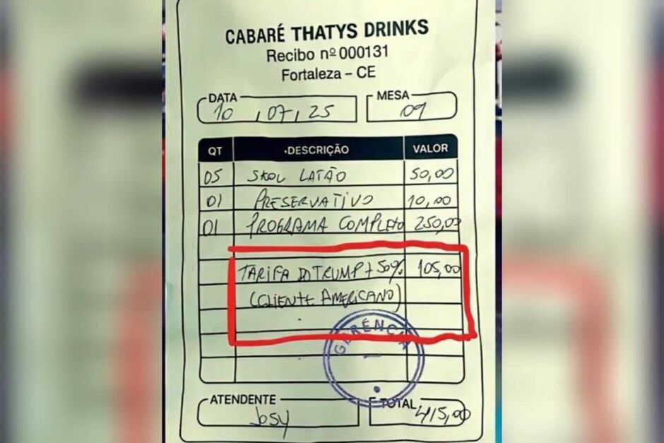 Como de costume, o brasileiro não perde tempo quando o assunto é criar memes e fazer piada com a própria tragédia — e com o tarifaço anunciado por Donald Trump, não seria diferente. Está circulando nas redes sociais a imagem de um recibo de um cabaré de Fortaleza (CE), no qual consta a cobrança de uma taxa adicional de 50% a um suposto cliente norte-americano, em resposta à sobretaxa imposta pelos Estados Unidos a produtos brasileiros.