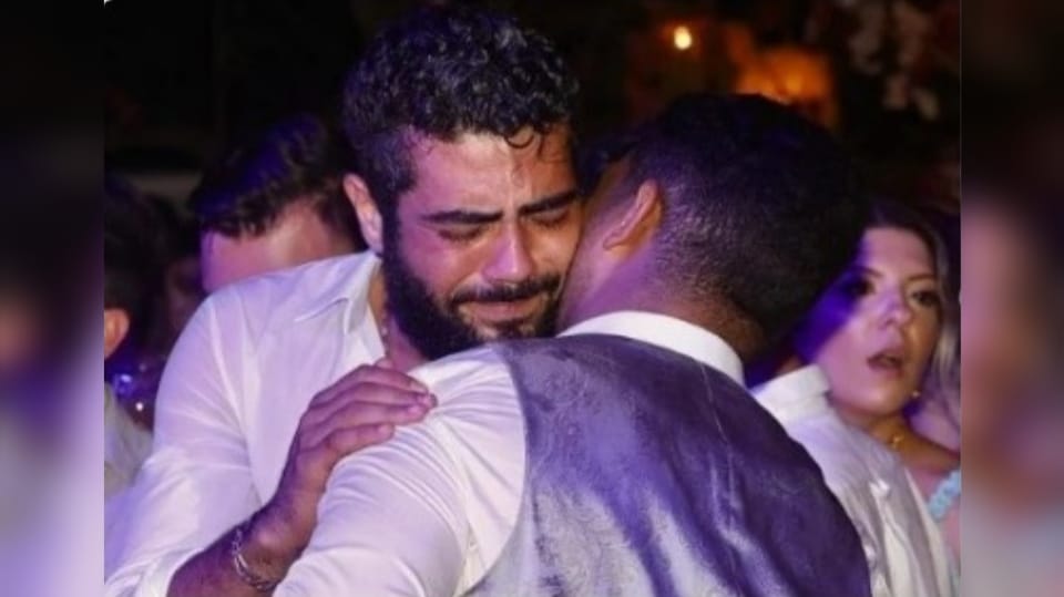 O artista chorou ao lembrar da amiga, no casamento realizado em Trancoso, na Bahia.