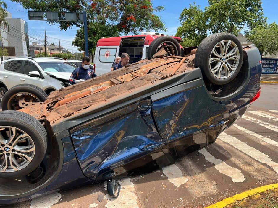 Na manhã desta quinta-feira (27), uma BMW capotou após se envolver em acidente de trânsito no cruzamento da Avenida Hayel Bon Faker com Rua Monte Alegre, em Dourados, município a 221 quilômetros de Campo Grande.