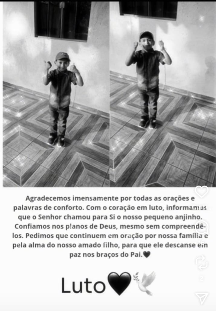 A confirmação da morte do menino foi feita pelo pai em uma rede social: "Com o coração em luto, informamos que o Senhor chamou para Si o nosso pequeno anjinho. Pedimos que continuem em oração por nossa família e pela alma do nosso amado filho."