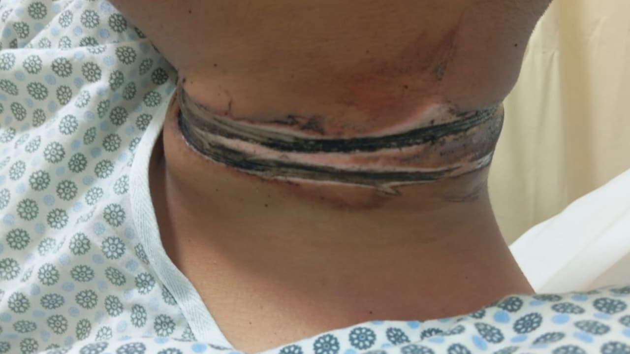 A vítima foi socorrida pelo Samu (Serviço de Atendimento Móvel de Urgência) e levado para o Hospital Nossa Senhora Aparecida. Fotos retiradas no hospital e enviadas a reportagem do Perfil News mostram queimaduras e vergões no pescoço do jovem, causados pelos fios.
