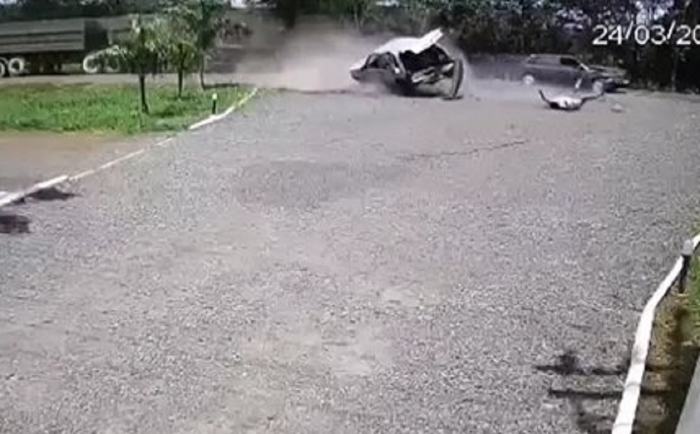 Imagens flagraram o momento em que uma mulher foi arremessada de dentro de um veículo, em um acidente que ocorreu na Serra Sucuriú, em Paraíso das Águas, a 282 quilômetros de Campo Grande. O acidente envolveu dois veículos, sendo um VW Gol e um Fiat Uno.