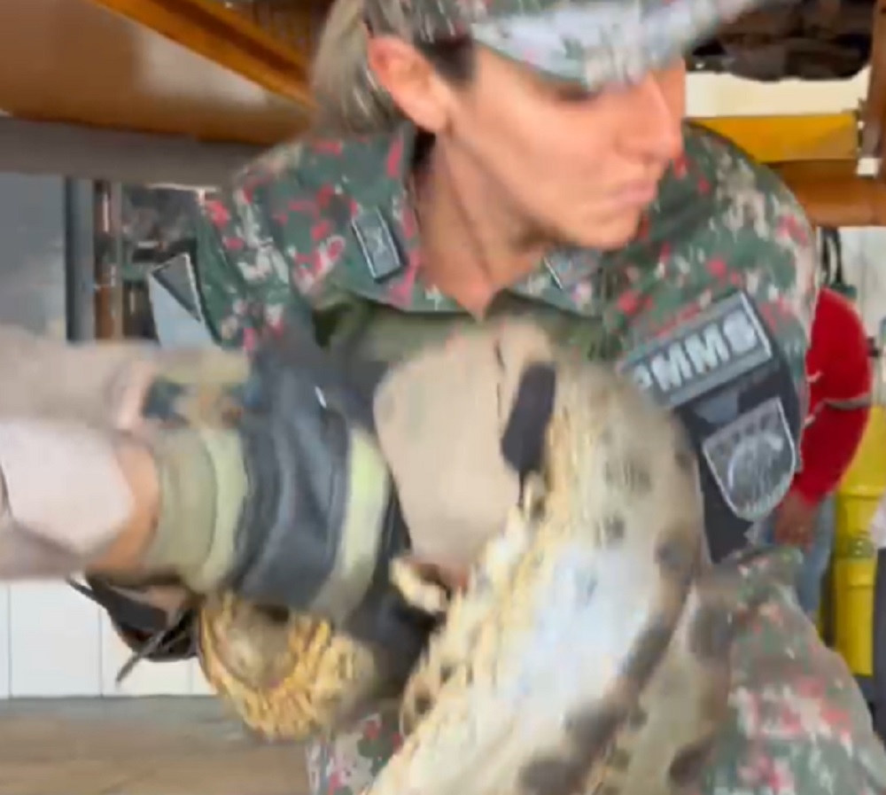 Com o veículo suspenso, a equipe conseguiu retirar a serpente sem ferimentos. A sucuri foi avaliada, considerada saudável e, posteriormente, devolvida ao seu habitat natural.