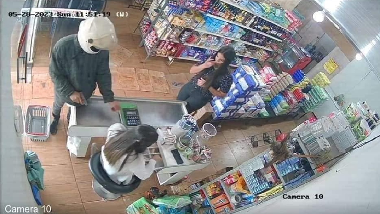 Câmeras de segurança flagraram o momento em que um homem não identificado invadiu um mercado em Tavapy, município paraguaio, usando um capacete e com uma arma na mão.
