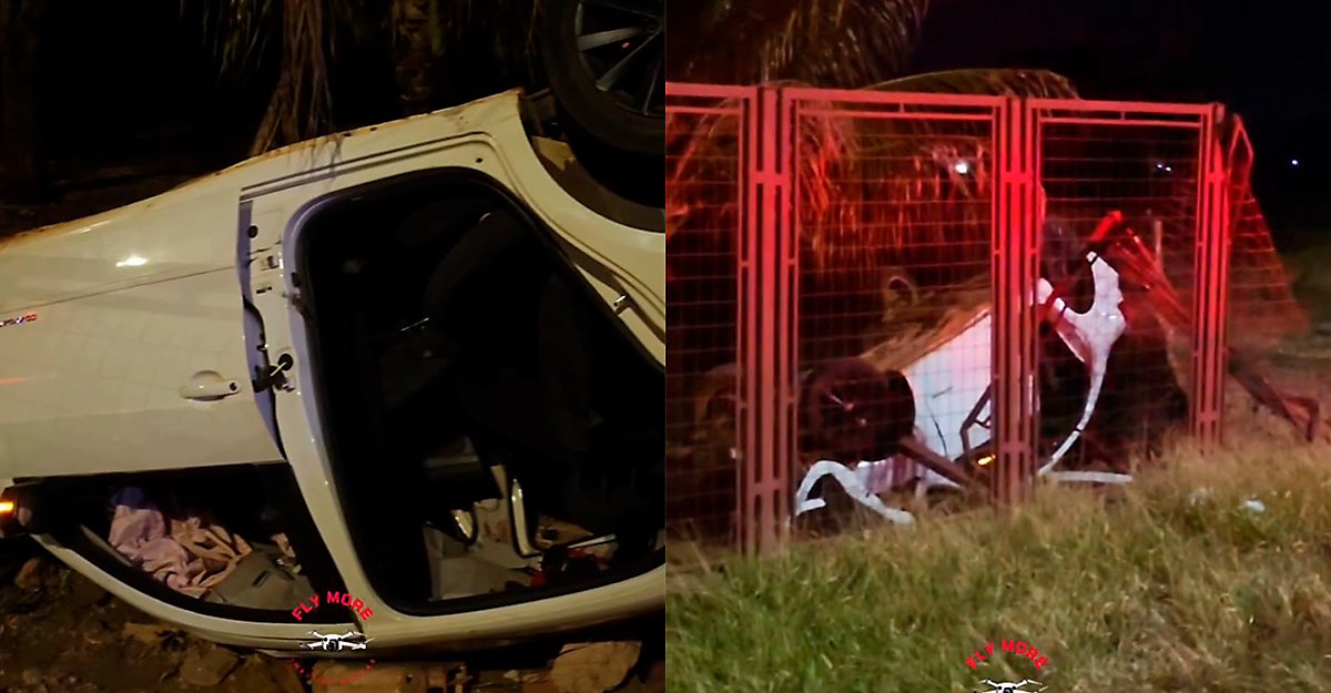 Imagens que circulam nas redes sociais, divulgadas pela página flymore_cg, mostram o carro capotado, depois de destruir uma grade da Gury Marques.