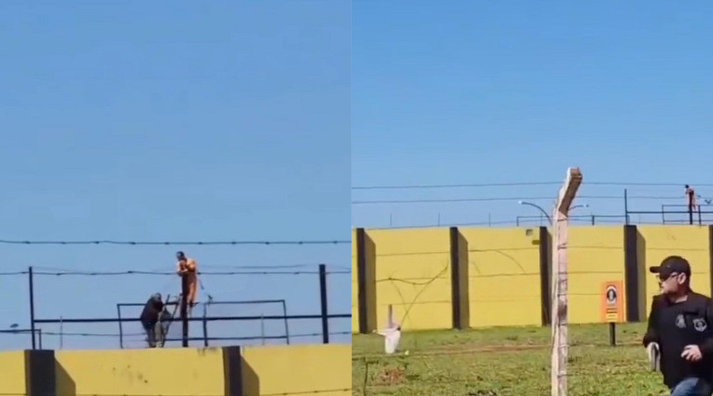 ''Maluco tentando fugir'', exclamou um homem. Em seguida foi possível ver policiais armados tentando se aproximar do presidiário. Quando um servidor subiu no local para deter o prisioneiro, é possível ver algo parecido a uma corda amarrada ao pescoço dele, o que sugere tentativa de suicídio.