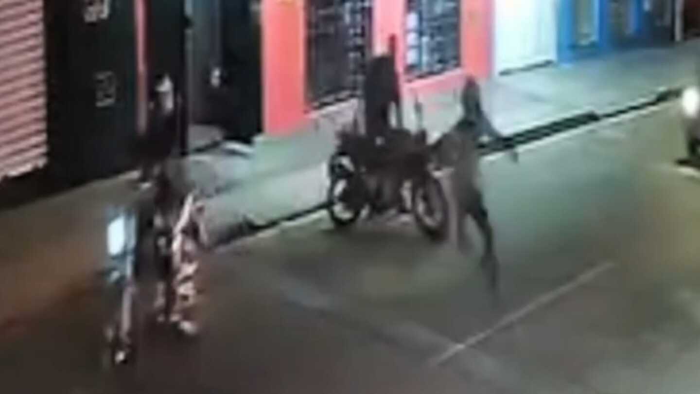 Ele então aparece correndo e segurando a moto quanto o bandido foge correndo à pe. O outro suspeito, que estava em uma motocicleta ao lado da que seria levada, acelera e sai em disparada.