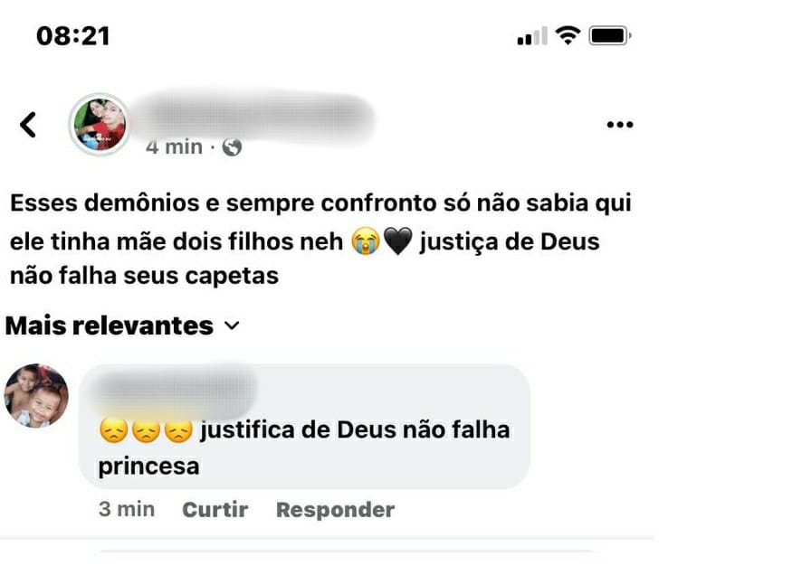 “Esses demônios e sempre confronto, só não sabia que aqui ele tinha mãe, dois filhos né. Justiça de Deus não falha seus capetas”, publicou a mulher.
