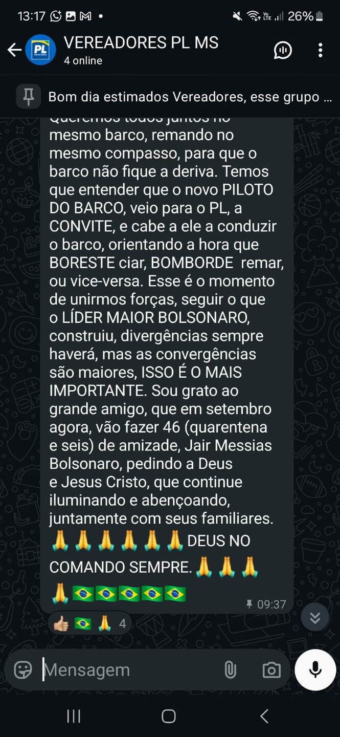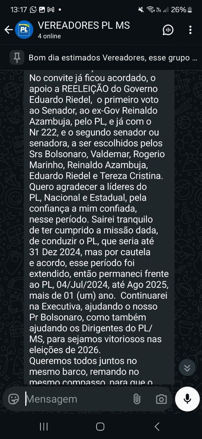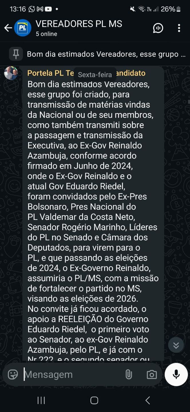 “Esse grupo foi criado para transmissão de matérias vindas da Nacional ou de seu membros, como também transmitir sobre a passagem e transmissão da Executiva, ao ex-governador Reinaldo Azambuja, conforme acordo firmado em junho de 2024, onde o ex-governador Reinaldo e o atual governador Eduardo Riedel, foram convidados pelo ex-presidente Bolsonaro, presidente nacional do PL, Valdemar da Costa Neto, senador Rogério Marinho, Líderes do PL no Senado e Câmara dos Deputados, para virem para o PL, e que passando as eleições de 2024, o Ex-Governo Reinaldo, assumiria o PL/MS, com a missão de fortalecer o partido no MS, visando as eleições de 2026”, disse Portela.