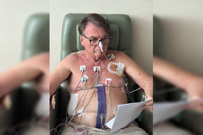 Imagem divulgada nas redes sociais mostra o ex-presidente lendo um papel e com acessos espalhados pelo corpo, além de uma cicatriz na região central do abdômen — resultado da mais recente intervenção cirúrgica a que foi submetido. “Agradeço, de coração, todas as orações, mensagens e o carinho de todos vocês”, escreveu Bolsonaro.