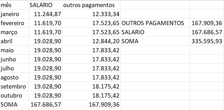 Referente ao seu salário, Thelma teve um aumento de 69,19% no mês de abril, saltando de R$ 11.244,87 para R$ 19.028,90. Ao todo, em 10 meses, ela recebeu R$ 167.686,57.