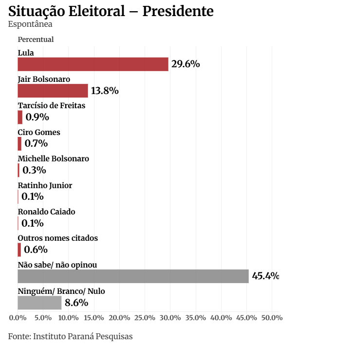 Na pesquisa espontânea, Lula apresenta grande vantagem para o ex-presidente Jair Bolsonaro (PL), com 29,6% e 13,8% das intenções de voto, respectivamente. Bolsonaro, no entanto, encontra-se inelegível por abuso de poder político.