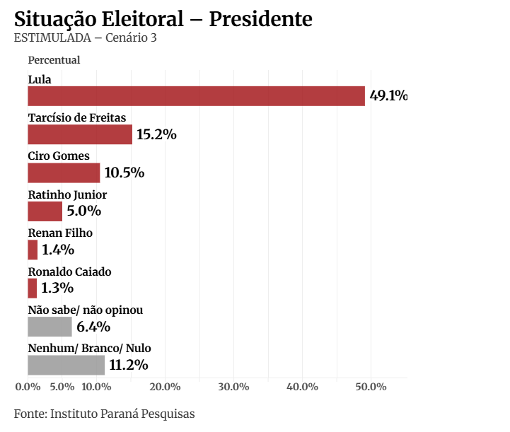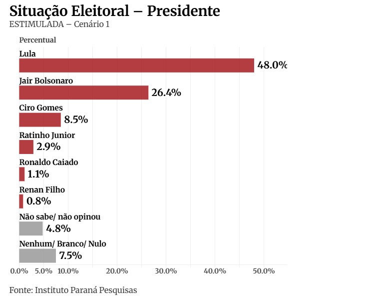 No primeiro cenário da pesquisa estimulada, em que uma lista de candidatos é apresentada, Lula lidera com 48% das intenções de voto contra 26,4% de Bolsonaro. Na sequência, vêm Ciro Gomes (PDT), com 8,5%, e os governadores do Paraná e de Goiás, Ratinho Junior (PSD) e Ronaldo Caiado (União Brasil).