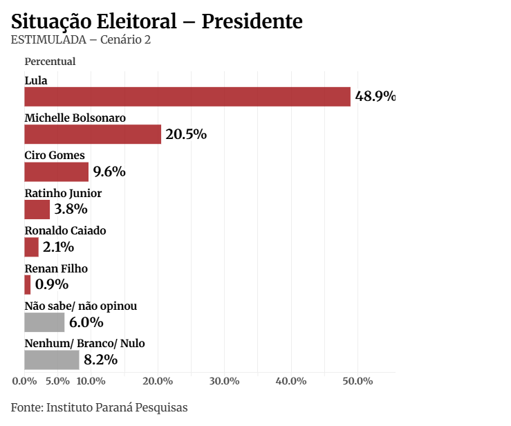 No cenário 2, quando Michelle Bolsonaro é colocada no páreo, Lula mantém a ampla vantagem, com 48,9% dos votos ante 20,5% da ex-primeira-dama.