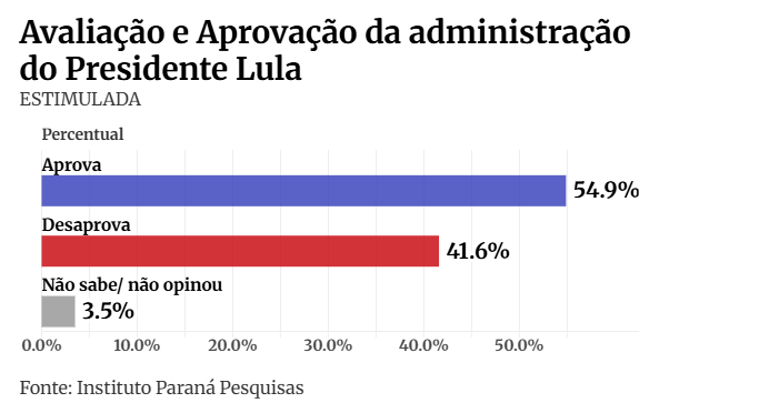 O levantamento questionou os eleitores de Pernambuco sobre a avaliação da atual gestão do governo Lula. Mais da metade dos eleitores, 54,9%, aprova a administração.