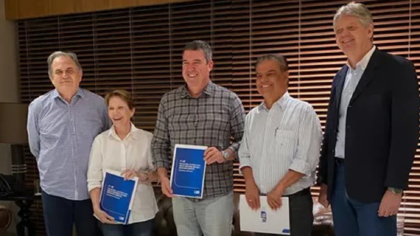 Governador Eduardo Riedel (PSDB) se encontrou com o senador Nelsinho Trad (PSD) e a senadora Tereza Cristina (Progressistas), na noite desta quarta-feira (23), em Campo Grande. O encontro se dá poucos dias antes dos parlamentares embarcarem para os EUA na tentativa de reverter as tarifas impostas aos produtos brasileiros.