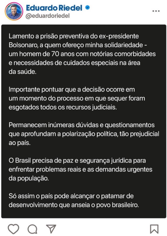 Em sua fala, Riedel expressou solidariedade a Bolsonaro, destacando a idade avançada e as comorbidades do ex-presidente. "Lamento a prisão preventiva do ex-presidente Bolsonaro, a quem ofereço minha solidariedade - um homem de 70 anos com notórias comorbidades e necessidades de cuidados especiais na área da saúde", afirmou o governador.