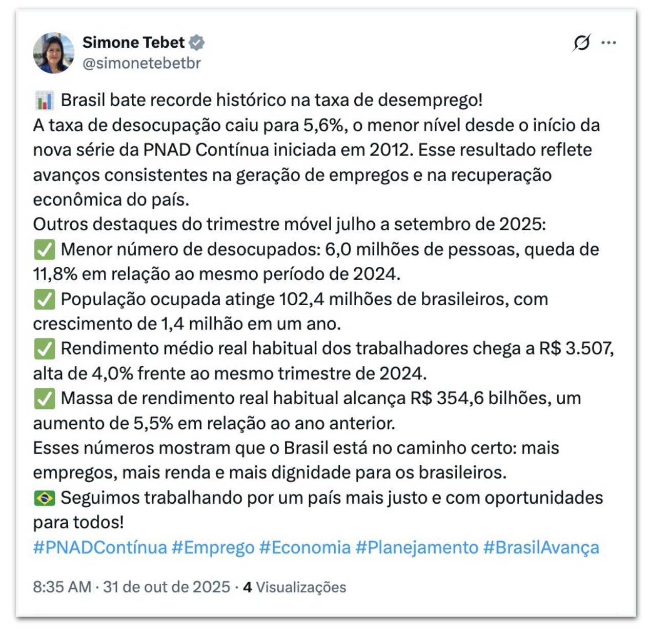 A taxa de desemprego no Brasil caiu para 5,6% em setembro, o menor nível desde o início da nova série da Pnad Contínua, em 2012. O dado, que só seria divulgado oficialmente às 9h desta sexta-feira (31) pelo IBGE (Instituto Brasileiro de Geografia e Pesquisa), foi publicado mais cedo no X (antigo Twitter) pela ministra do Planejamento e Orçamento, Simone Tebet, às 8h35, e depois apagado.
