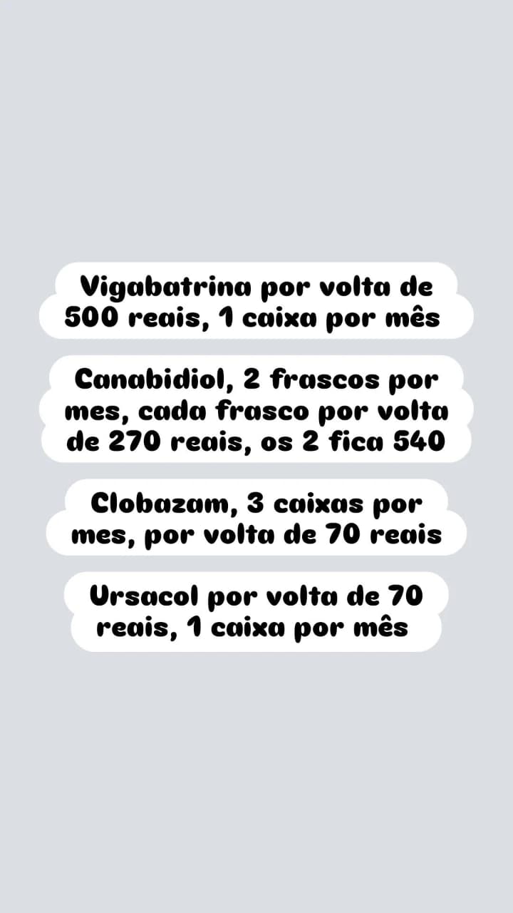 Além disso, o ursacol (para o fígado) e o canabidiol (utilizado como anticonvulsivante) não são fornecidos pela rede pública. O ondasetrona, indicado para o estômago, Andressa consegue por meio de doações.