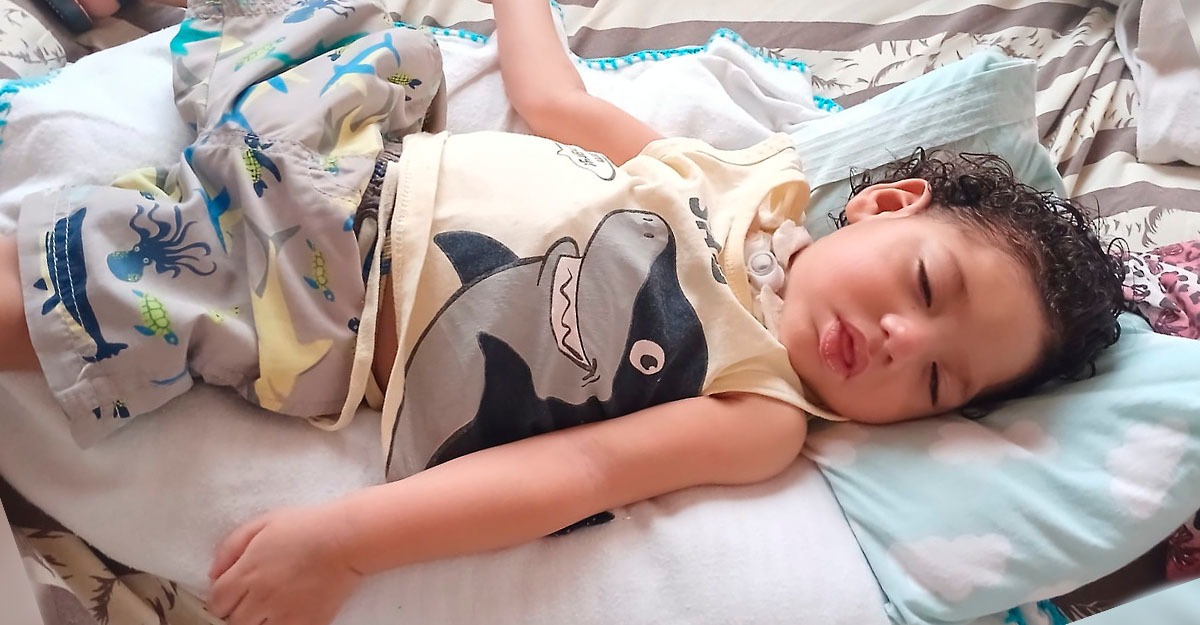 O pequeno guerreiro além dos problemas de saúde já citados também tem alergia à proteína do leite de vaca, intolerância à lactose, alimenta-se por sonda gástrica (GTT) e utiliza traqueostomia.